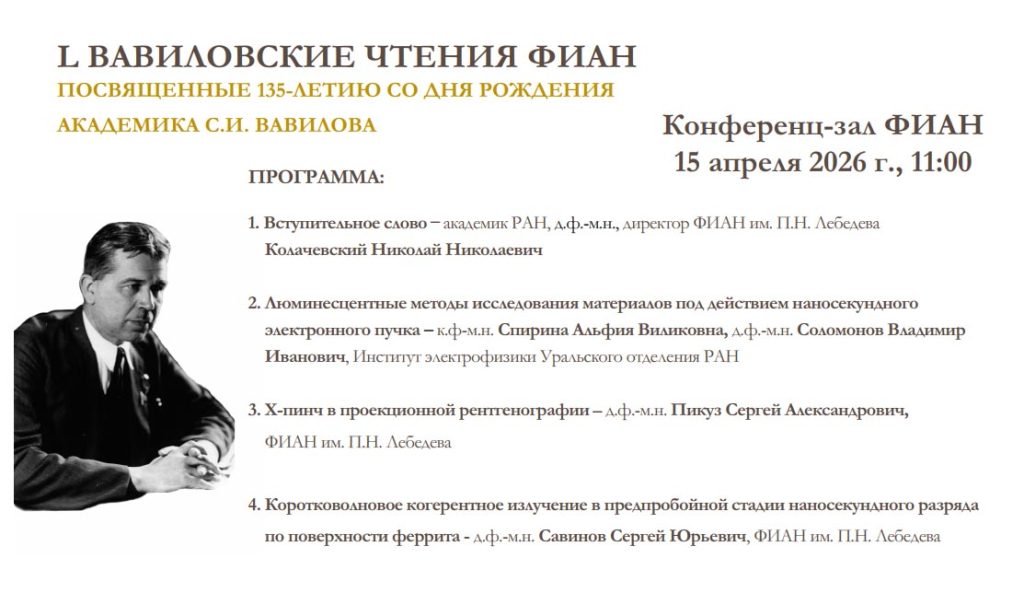 Мероприятие состоится 15 апреля 2026 г. в 11:00 в конференц-зале ФИАН (Москва, Ленинский пр., д. 53, 3 этаж) и предполагает выступление директора института, академика РАН Н.Н. Колачевского, три научных доклада и фуршет.